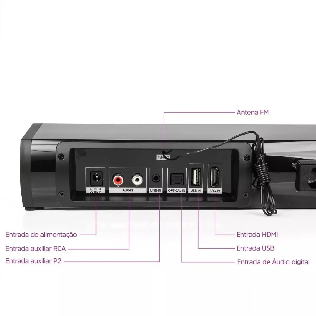 -Conexões Bluetooth versão 5.0 , HDMI, Óptica Digital, RCA e Plug P2